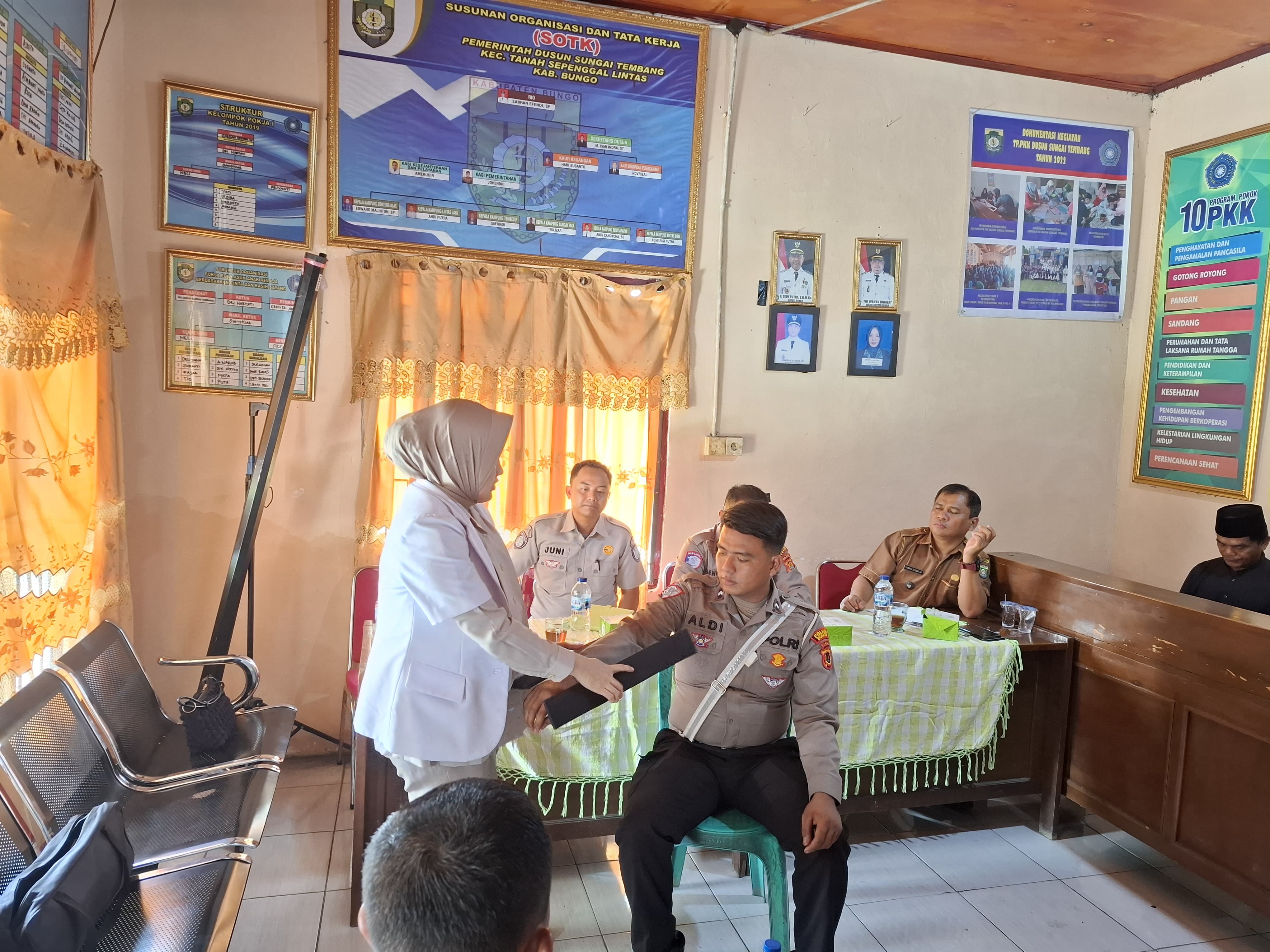 Pelatihan ini dihadiri oleh Datuk Rio Desa, perangkat desa, BPD, Babinkamtibmas, RT, serta RW Desa Sungai Tembang. Narasumber dari Dokter Klinik Bhayangkara Polres Bungo, dr. Isti Puji Lestari, turut memberikan materi terkait tata cara pertolongan pertama yang dapat dilakukan masyarakat sebelum tim medis datang ke lokasi kejadian.